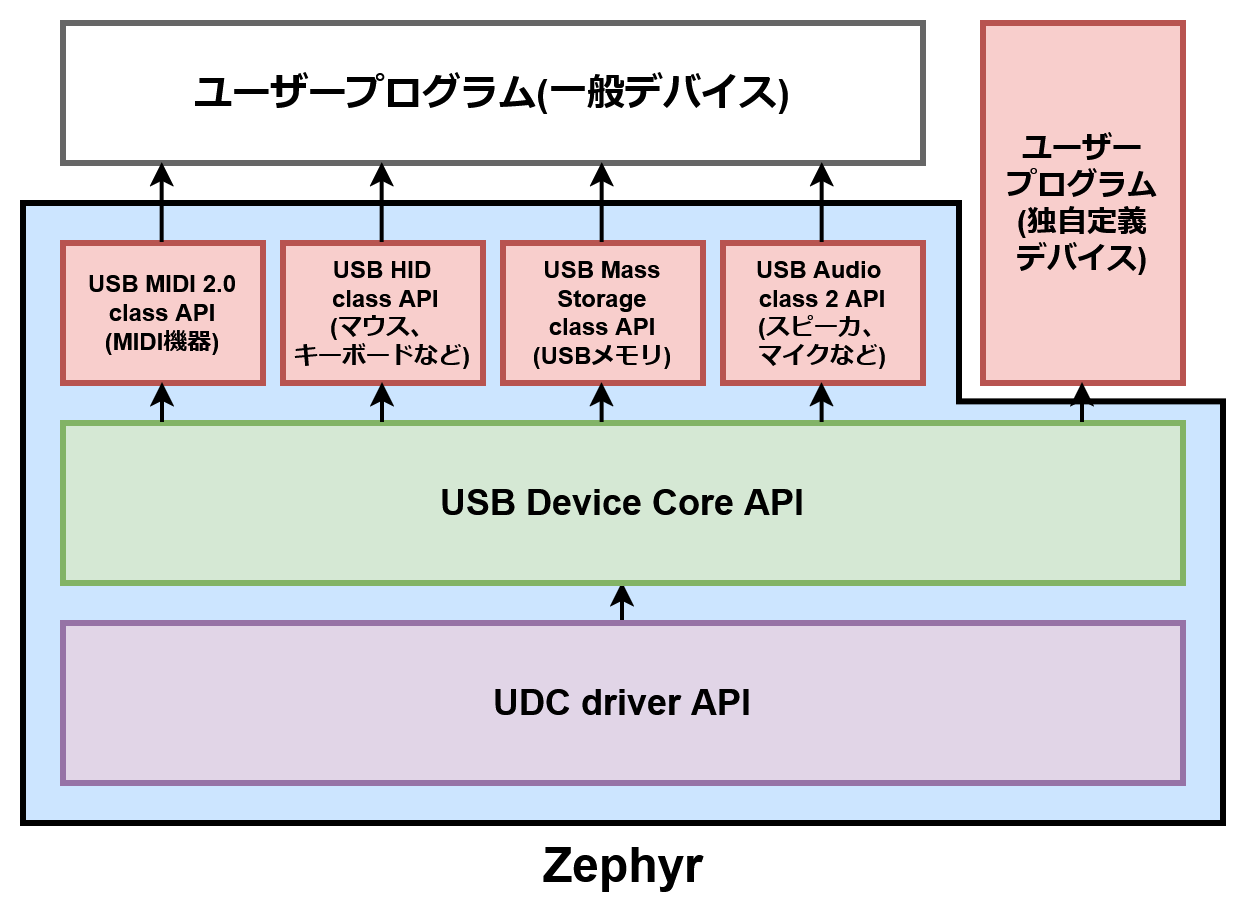 - 低レイヤな制御を「USB Device Controller(UDC) driver API」が担う。